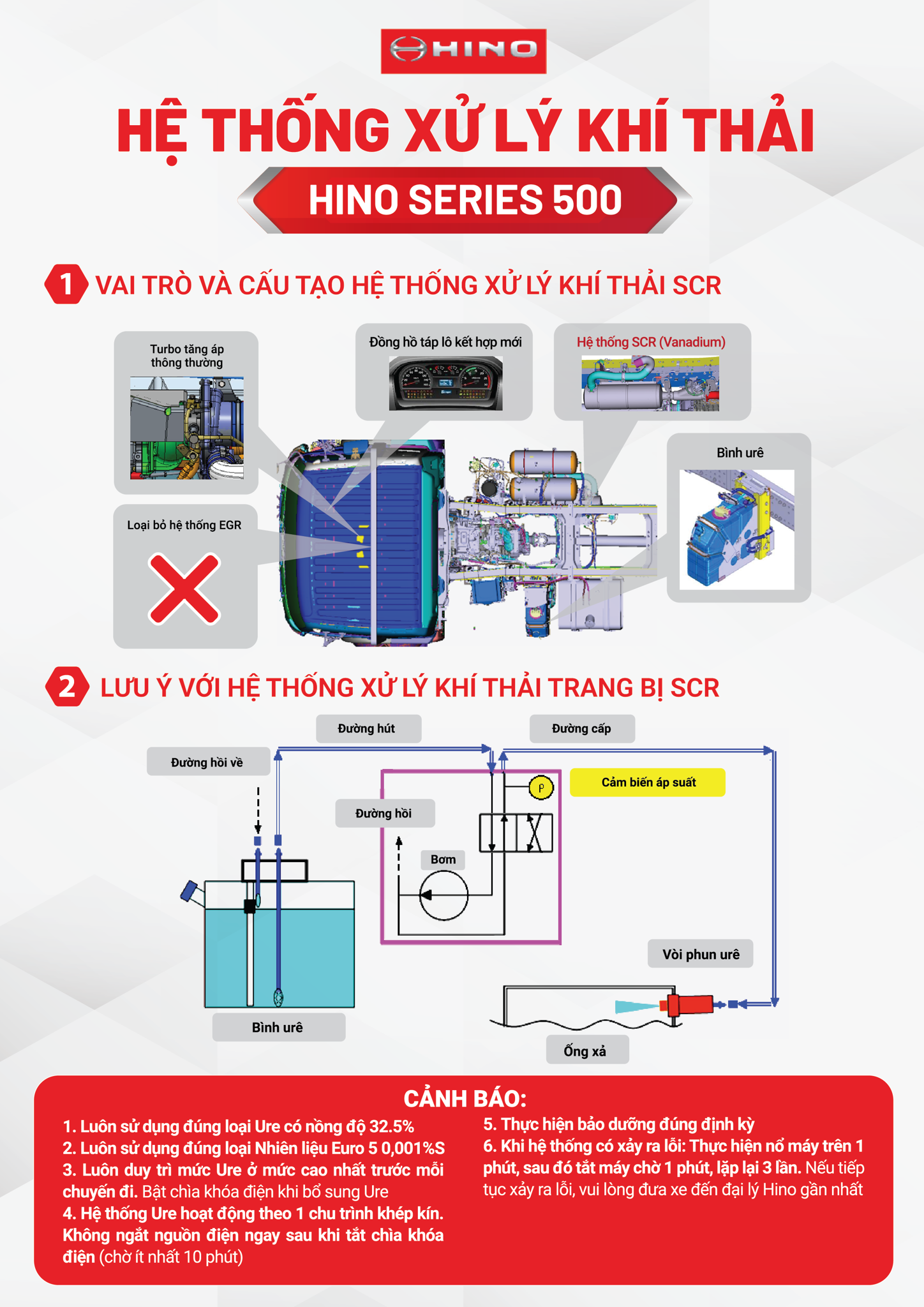 - Hino 500 và 700 với SCR: Giải pháp vận tải trung và nặng, giảm NOx, tối ưu hiệu suất đường dài.
